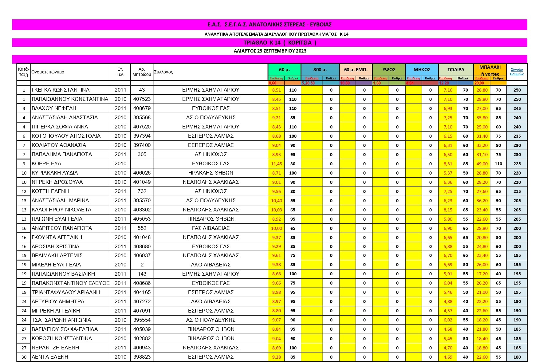 | 11 | ΜΑΚΡΗ ΑΛΕΞΑΝΔΡΑ | ΓΣ ΝΕΑΠΟΛHΣ ΧΑΛΚΙΔΑΣ | 50 | 8,30 |